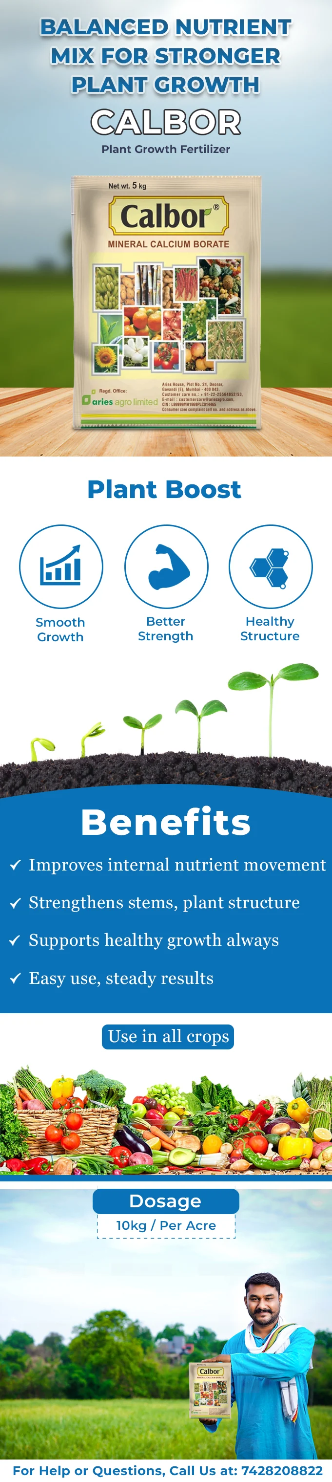 कैलबोर एक विशेष उर्वरक है, जो पौधों की वृद्धि, प्रकाश संश्लेषण, शर्करा परिवहन और कोशिका भित्ति निर्माण में आवश्यक पोषक तत्व प्रदान करता है। यह सभी फसलों और पौधों की बढ़वार के सभी चरणों में उपयोग के लिए उपयुक्त है।