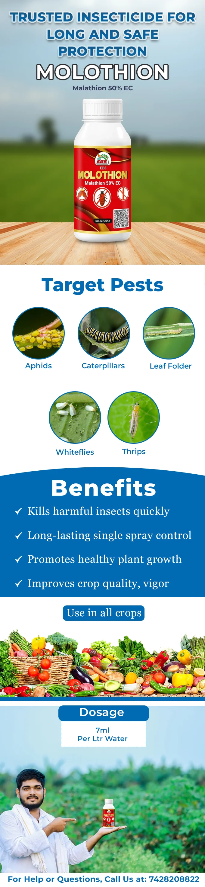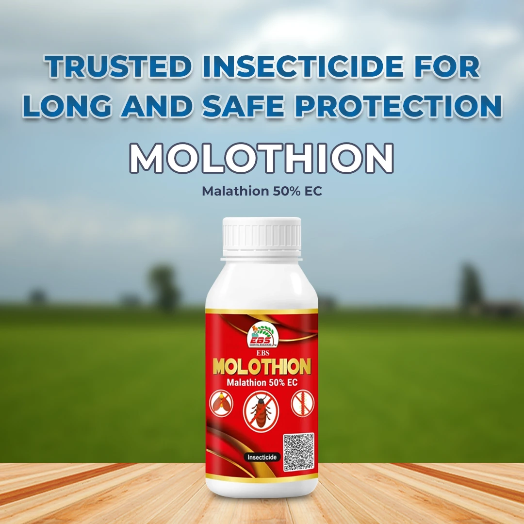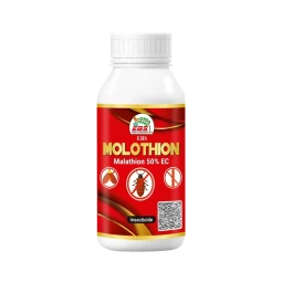 मालाथियन (50%): मालाथियन एक ऑर्गनोफॉस्फेट कीटनाशक और एकेरिसाइड है जो कई प्रकार के कीटों के विरुद्ध प्रभावी है, जिसमें उड़ने वाले और चलने वाले कीट शामिल हैं।