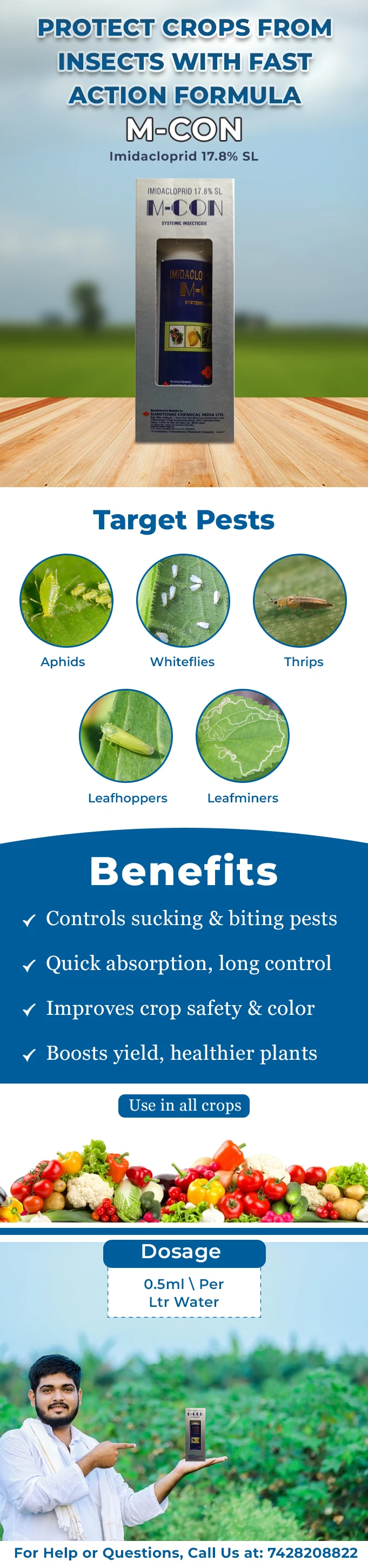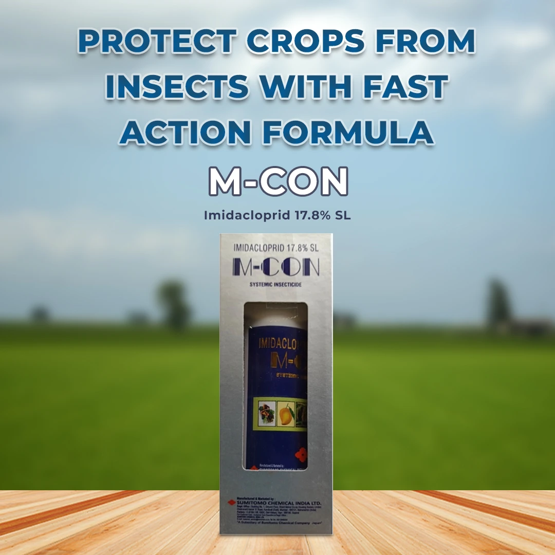 सुमितोमो एम-कॉन (इमिडाक्लोप्रिड 17.8% एसएल) एक प्रणालीगत कीटनाशक है, जो नेओनिकोटिनाइड समूह से संबंधित है और रस चूसने वाले कीटों और दीमकों को अत्यधिक प्रभावी तरीके से नियंत्रित करता है।