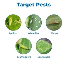 लक्षित कीट: माहू, सफेद मक्खी, थ्रिप्स, जैसिड, दीमक, हरा पत्ती फुदका, भूरा तना फुदका, सफेद पीठ वाला स्टेम हॉपर फुदका, मच्छर कीट (हेलिपेल्टिस)।