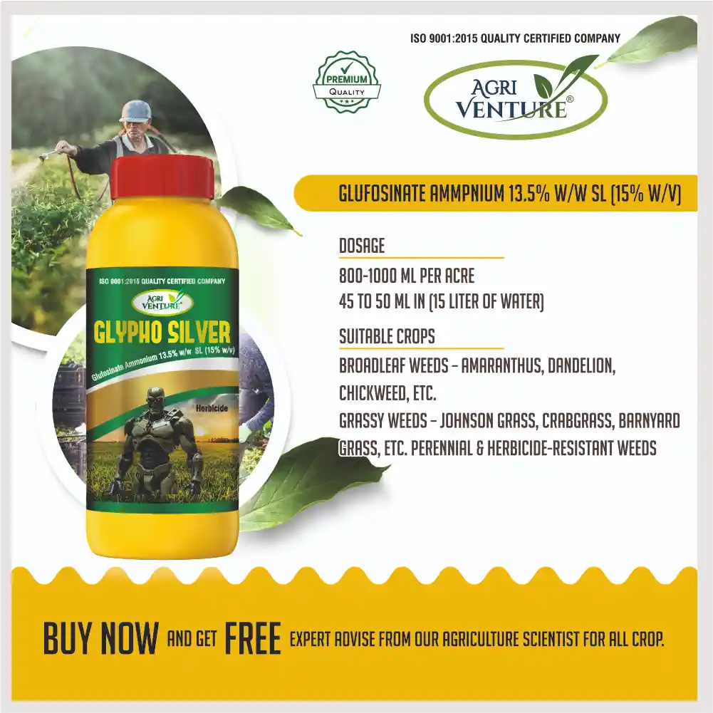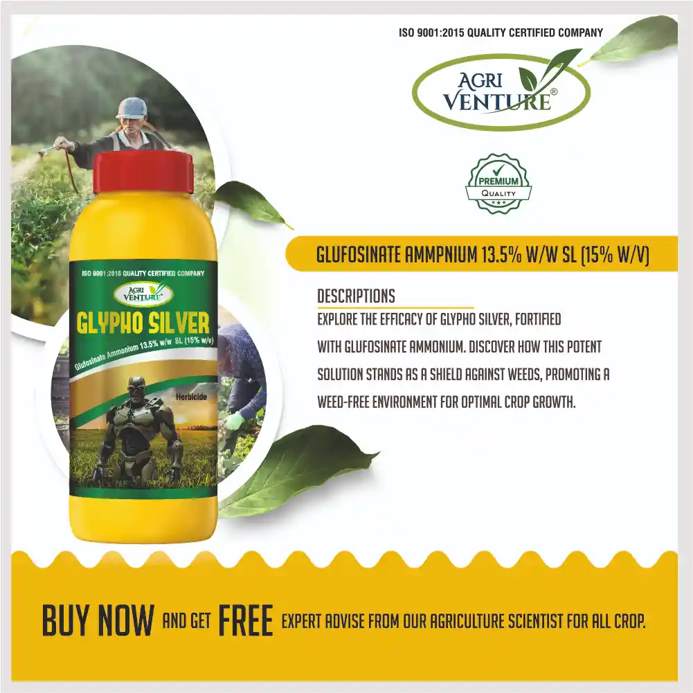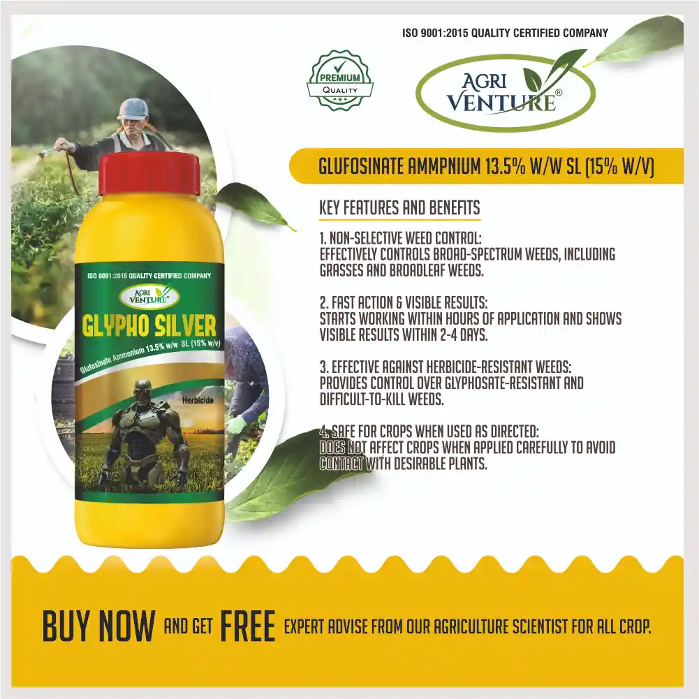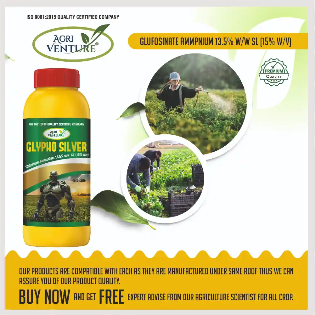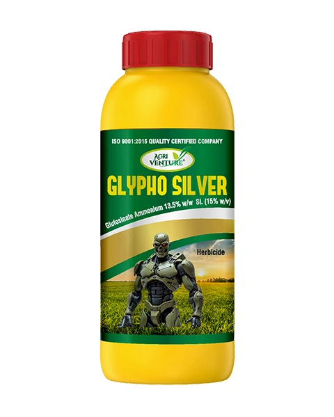AgriventureGLYPHO SILVER is a contact-based, non-selective herbicide formulated with Glufosinate Ammonium 13.5% SL. It provides quick and effective control over various grassy and broadleaf weeds in tea and cotton crops. The product is rainfast within 4–6 hours after application, ensuring consistent performance even under variable weather conditions. Its liquid formulation offers easy mixing and uniform spraying for efficient and safe weed management.