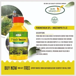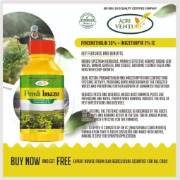 Agriventure Pendi Imaze is an advanced pre and post-emergent herbicide combining the dual power of Pendimethalin 30% and Imazethapyr 2% EC. It effectively controls annual grasses, broadleaf weeds, and sedges in soybean and groundnut crops. This formulation ensures long-term weed suppression, improving crop yield and reducing competition for nutrients and sunlight. Ideal for both early and late weed control stages, it provides extended protection throughout the crop cycle