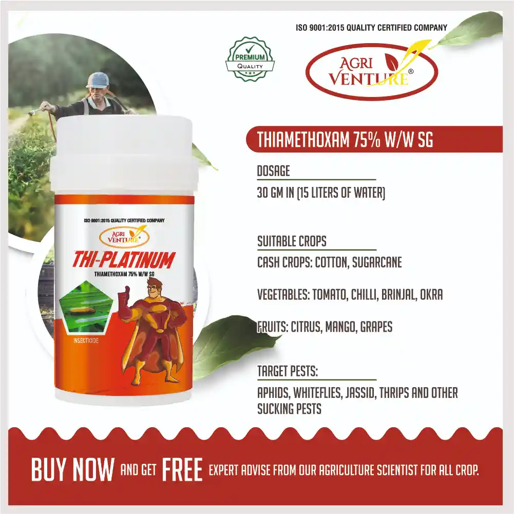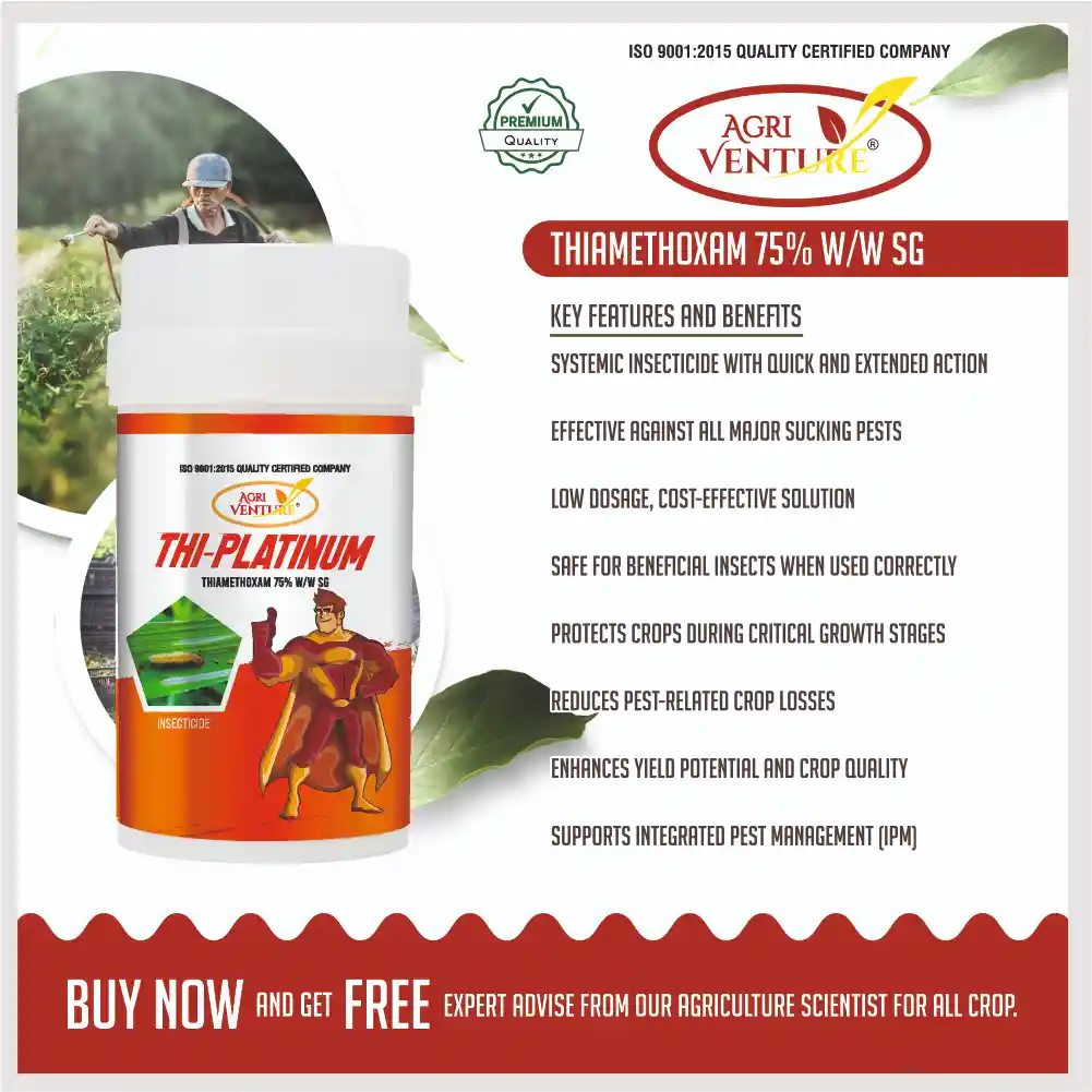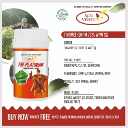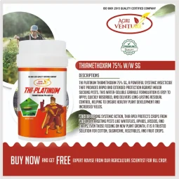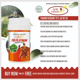Agriventure THI-Platinum Thiamethoxam 75% SG is a highly effective systemic insecticide formulated to control a wide range of sucking pests in multiple crops. It works through both contact and stomach action, ensuring rapid knockdown and long residual protection. Its systemic nature allows it to move throughout the plant, providing comprehensive protection from pest infestation and ensuring healthy, high-yielding crops.