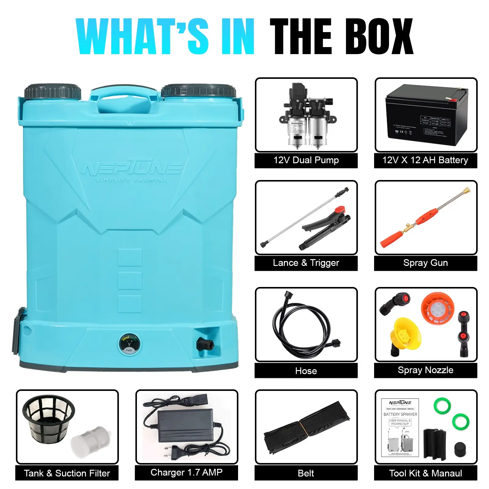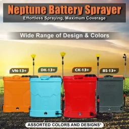 Neptune Model-13-Plus Battery Sprayer features a 12V 12Ah battery with a powerful double motor, 20L tank, and telescopic lance. It includes 4 interchangeable nozzles and delivers up to 20 ft spray range. Ideal for efficient farming and garden spraying tasks.