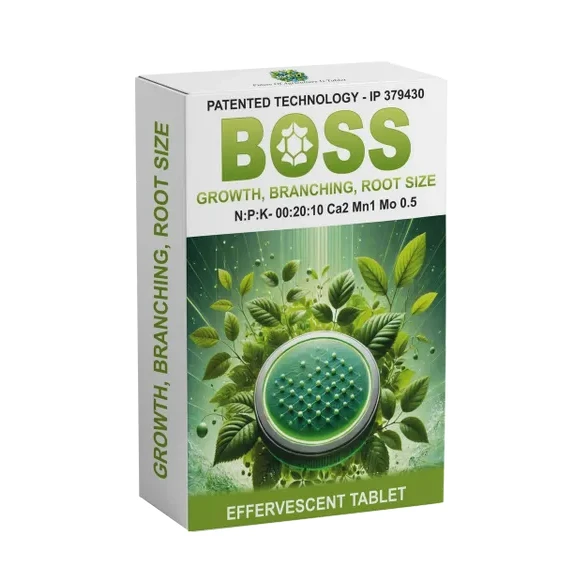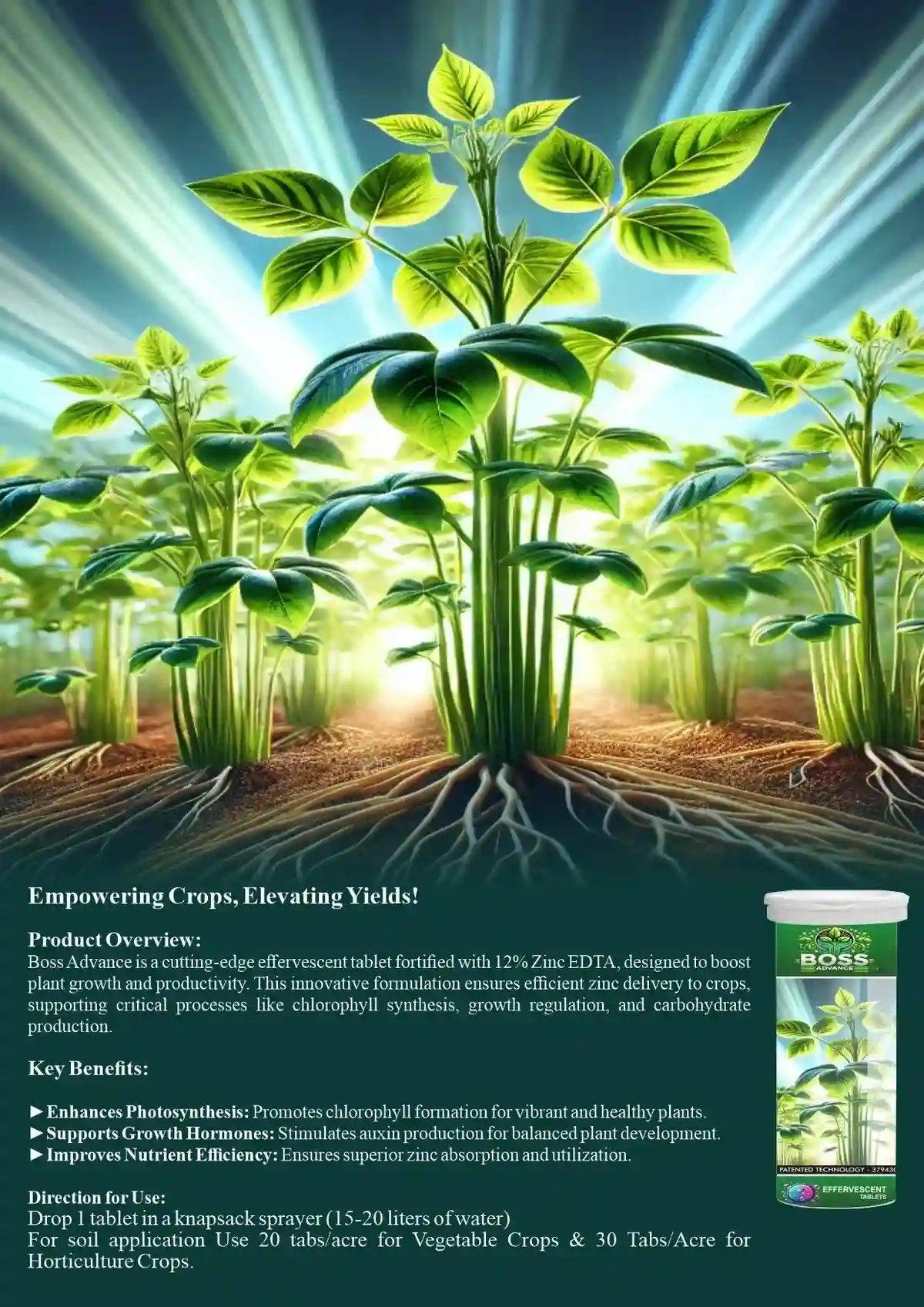Boss Advance is a cutting-edge effervescent tablet designed to enhance plant growth and maximize productivity. Its innovative nutrient formulation ensures efficient zinc delivery, supporting key processes like chlorophyll synthesis, growth regulation, and carbohydrate production. Boss Advance helps farmers cultivate healthier crops, promoting vibrant growth, improved nutrient uptake, and higher yields for sustainable agricultural success.
