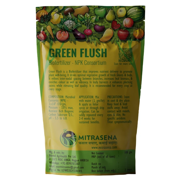 Green Flush Gold Biofertilizer boosts vegetative growth with NPK microbial consortia and biogenic carbon, improving shoots, leaves, and photosynthesis.