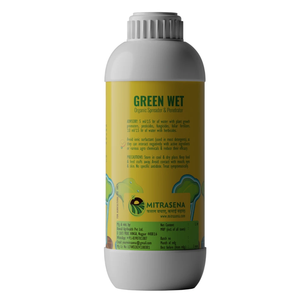 Green Wet by Biowall Agrihealth Pvt. Ltd. (MITRASENA) is a premium silicon-based non-ionic surfactant designed to enhance the effectiveness of agrochemicals including pesticides, insecticides, herbicides, micronutrients, and plant growth regulators. Acting as a spreader, sticker, and penetrator, it ensures better coverage, adhesion, and absorption, thereby improving field performance. Highly concentrated and safe, Green Wet works effectively with just 5 ml per 15 liters of spray solution, making it a cost-efficient and reliable activator for all crops.