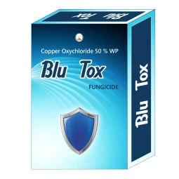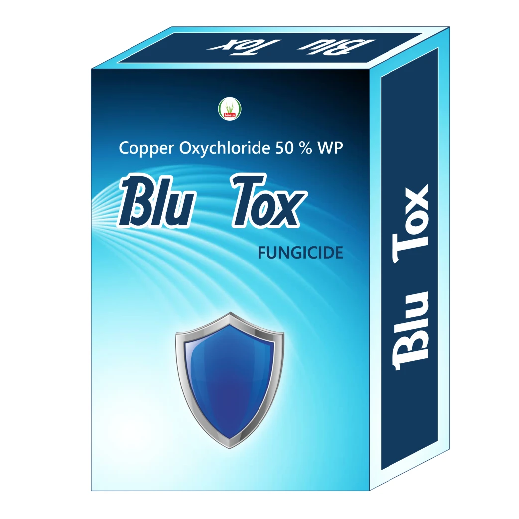 Blu Tox Copper Oxychloride 50% WP is a reliable contact fungicide that controls a wide range of fungal and bacterial infections in various crops. It provides preventive protection by forming a shield on leaves and stems, preventing disease-causing organisms from attacking the plants.