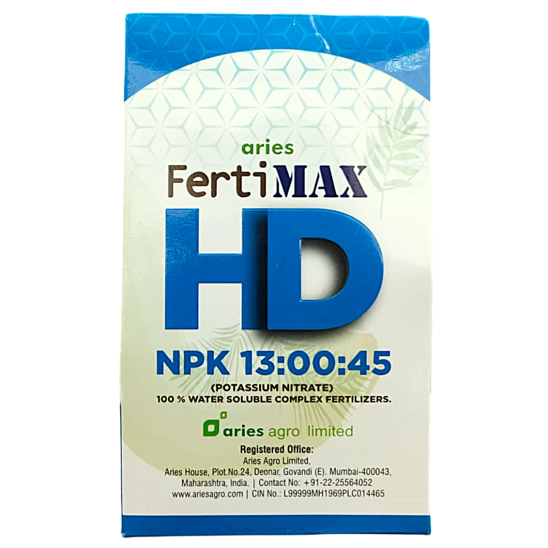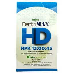 Aries Fertimax HD 13:00:45 is an NPK fertilizer containing Nitrogen, Phosphorus, and Potassium in a ratio of N=13:P=00:K=45. This NPK fertilizer provides a healthy amount of macro nutrients for optimal growth, and is very versatile due to its spraying and drip-irrigation mode of application.