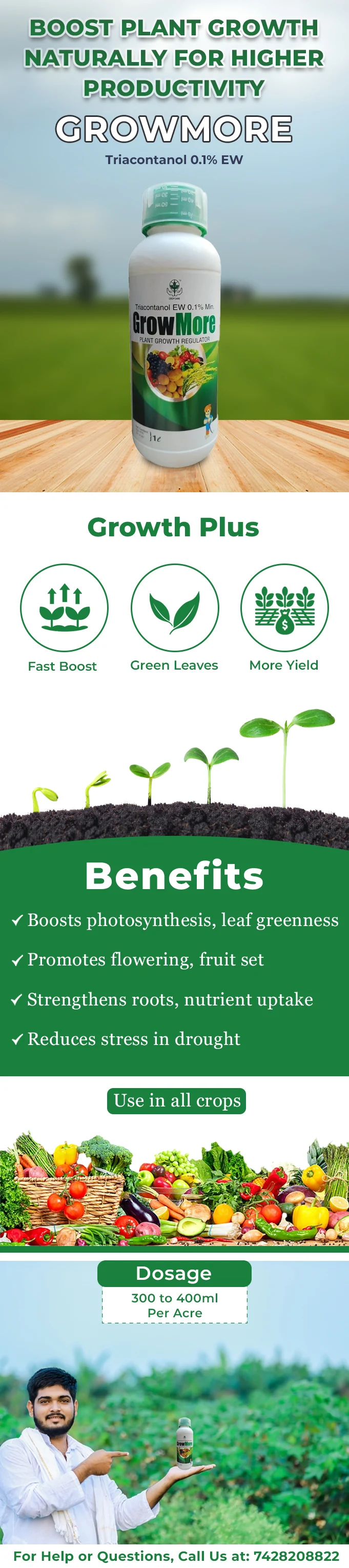 Grow More is suitable for use with cotton, tomatoes, chillies, rice, groundnuts, and potatoes.