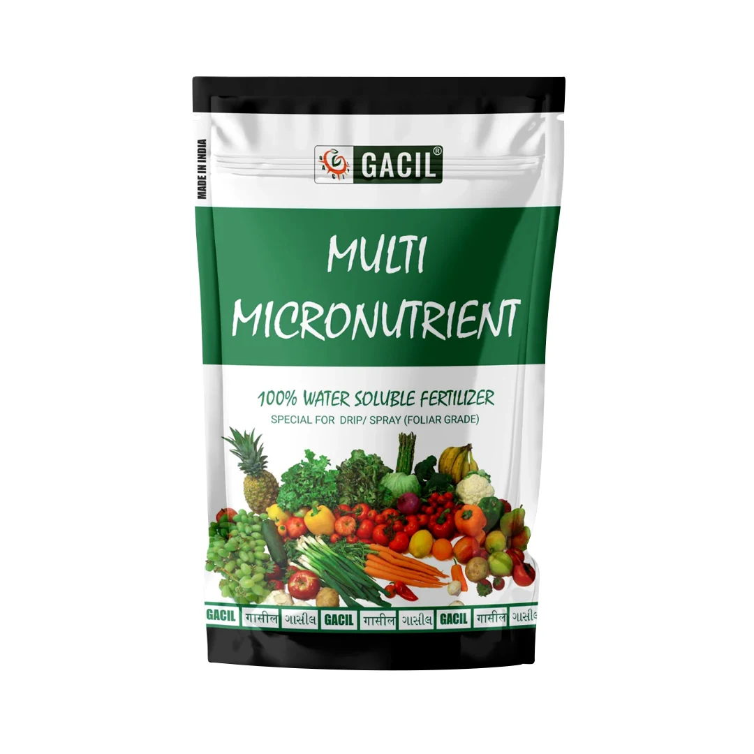 The Grade-1 Gacil Enriched Multi-micronutrients fertilizer is a great source of nutrients like Iron, Manganese, Zinc, Copper, and others, ensuring the best yields. This multi-micronutrient fertilizer is 100% water-soluble in water for easy mixing and application. Along with the crop growth promotion, this fertilizer also increases crop immunity and resistance for healthier growth.