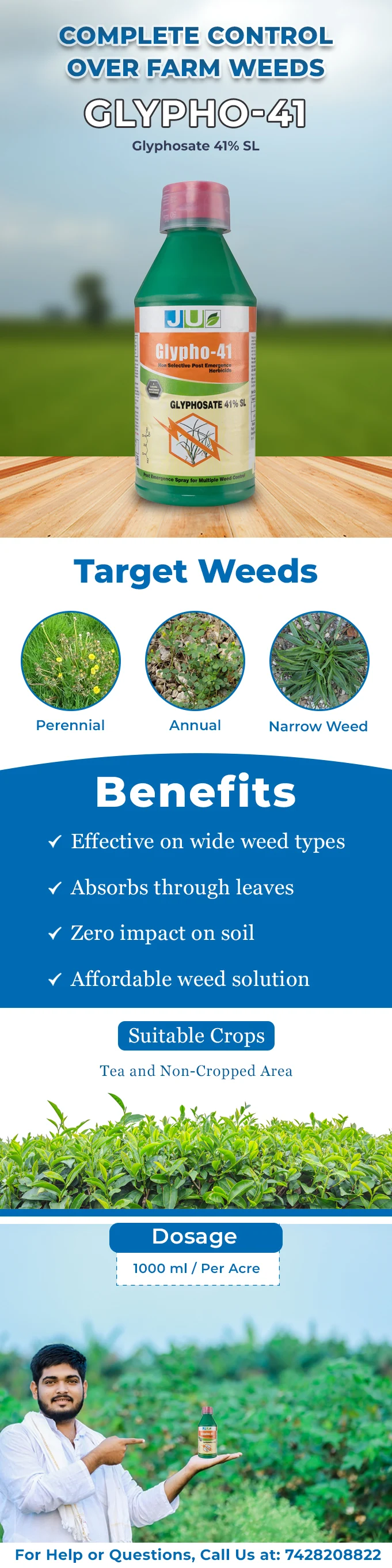 Non-selective Herbicide: JU Glypho-41 controls unwanted vegetation, annual, perennial, and narrow weeds.