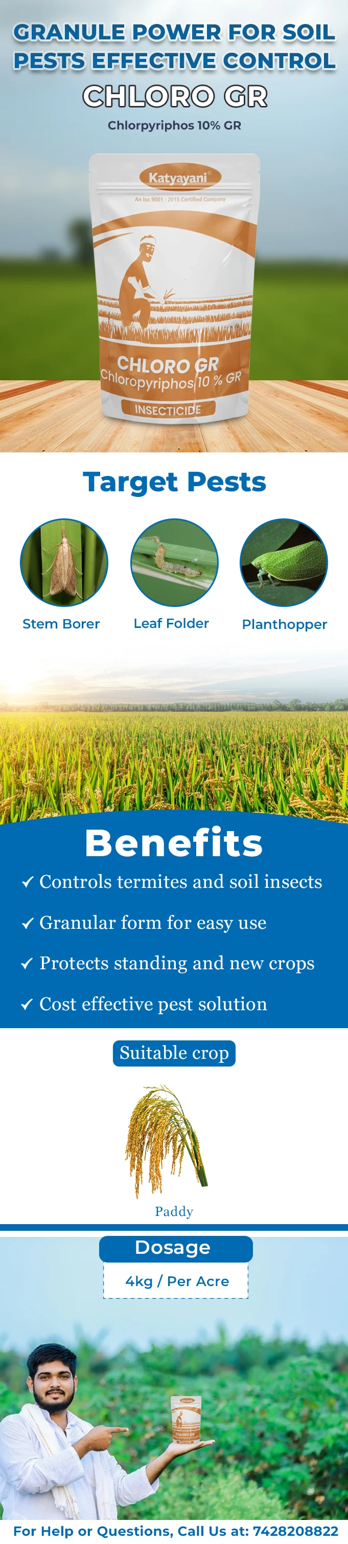 Broad-Spectrum Insecticide: Chloro GR insecticide targets leaf borer, aphids, jassids, mites, and other sucking and chewing pests.