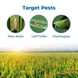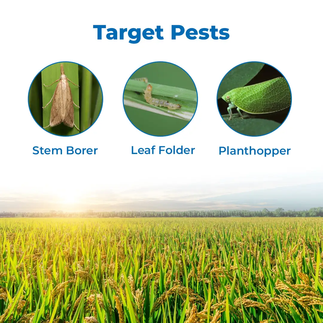 Rice | Stem borer, leaf folder, gall midge | 4 kg per acre |