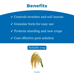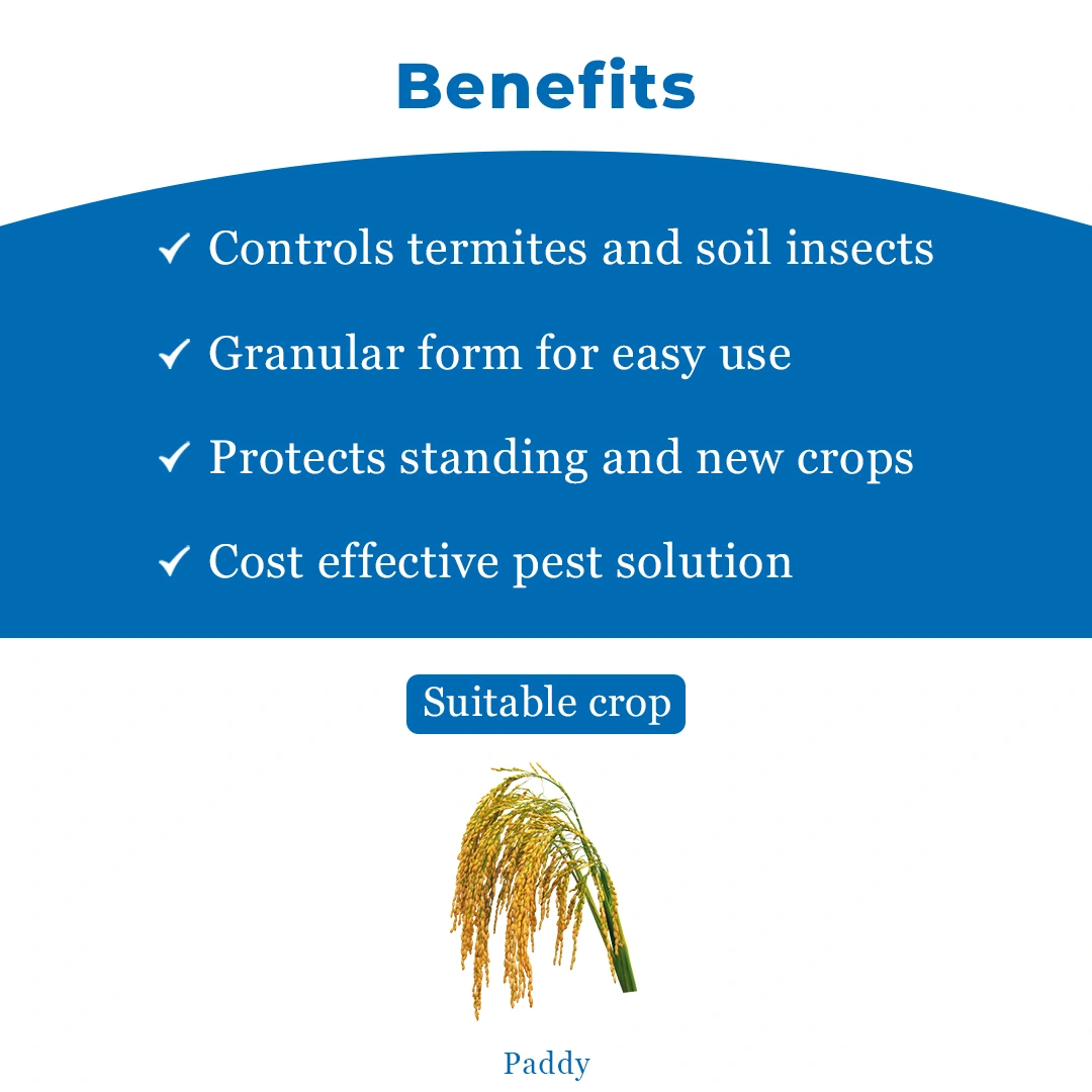 Triple-Action Formula: Chlorpyriphos 10% GR kills pests as soon as it comes into contact with crops through contact, respiratory, and stomach action.