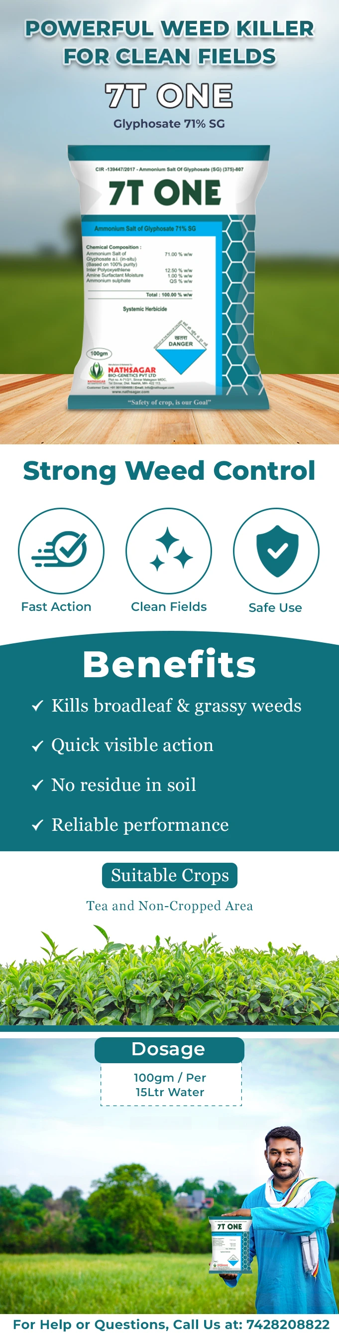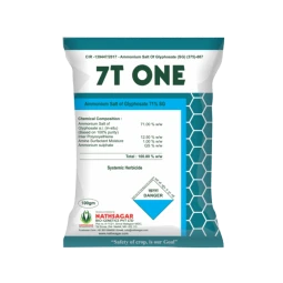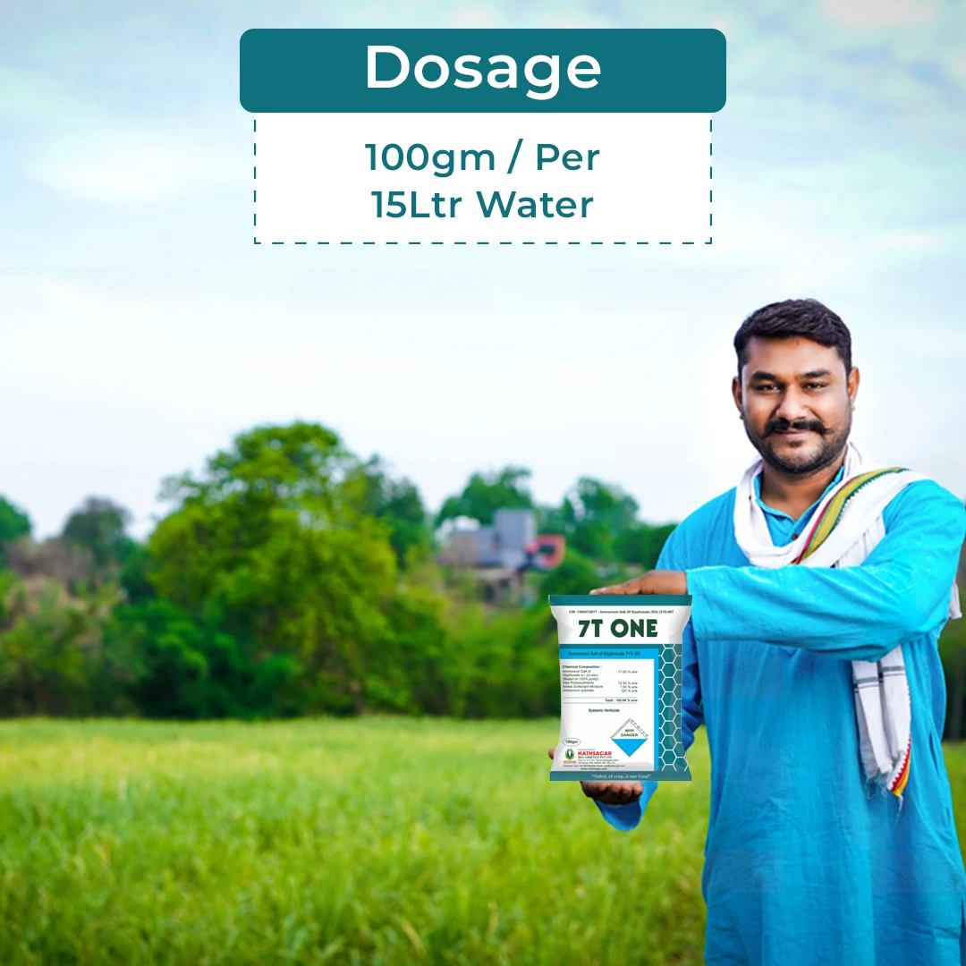 Nathsagar 7T One is a broad-spectrum non-selective herbicide that controls a wide range of weeds through systemic action. This non-selective herbicide contains Glyphosate 71% SG that eliminates the plantation and noxious weeds. Glyphosate 71% SG is a post-emergent herbicide that effectively targets weeds after they have emerged from the soil, offering a weed-free area.
