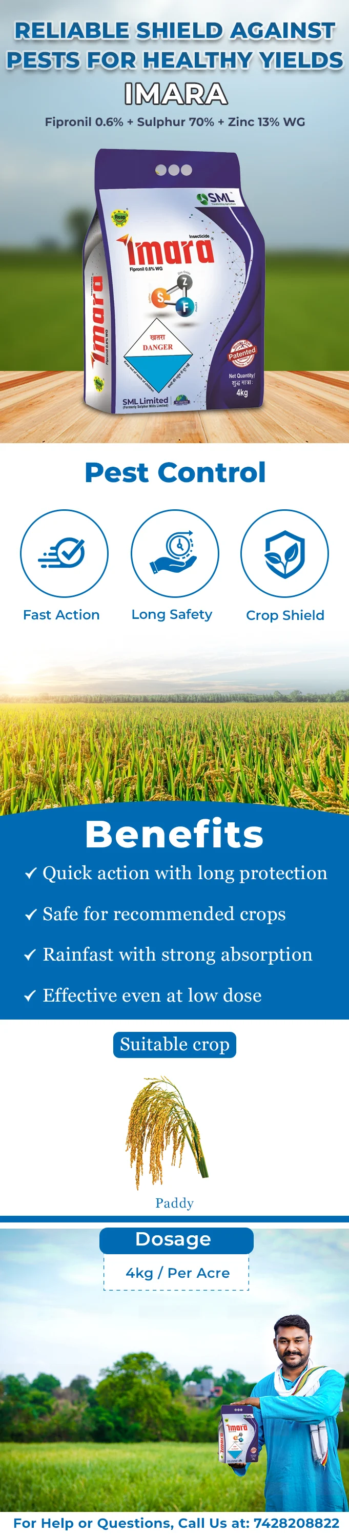 SML Imara is a two-in-one solution containing a triple formula of Fipronil 0.6% + Sulphur 70% + Zinc 13% WG, which provides effective pest protection in paddy. This unique insecticide provides essential nutrition for crop growth and immunity development. The Imara Sulphur Mills is easy to use and provides dual-action protection.