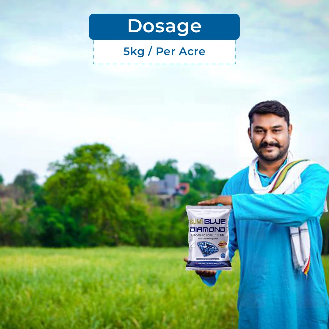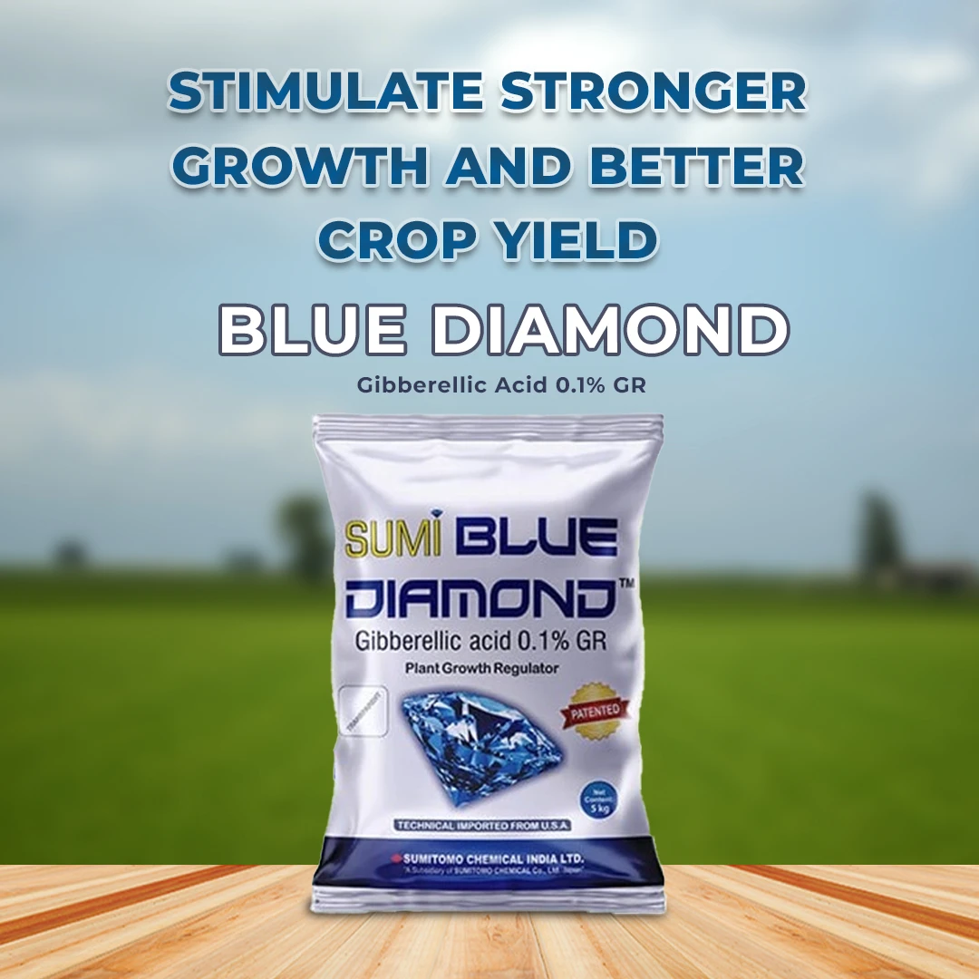 Sumi Blue Diamond is a Plant Growth Promoter (PGR) that contains Gibberellic Acid 0.1% GR. This growth promoter uses bioscience to enhance the height and growth of crops. Gibberellic Acid 0.1% GR makes crops resistant against stress conditions such as extreme heat and rain, maintaining the overall health of the crops.