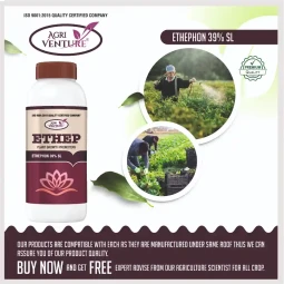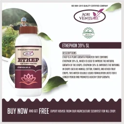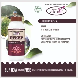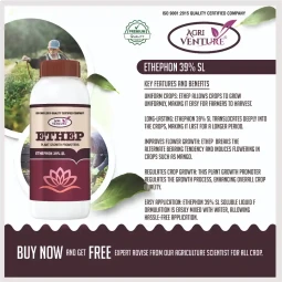 Agriventure ETHEP Ethephon 39% SL is a premium plant growth promoter designed to improve fruit ripening, enhance coloration, and boost overall productivity. Formulated with Ethephon 39% SL, this regulator releases ethylene upon application, promoting faster and more uniform fruit maturity. It is widely used for banana, mango, tomato, pineapple, and other fruit-bearing crops to achieve improved harvest quality and yield consistency. A reliable solution for commercial growers seeking higher market returns.
