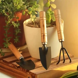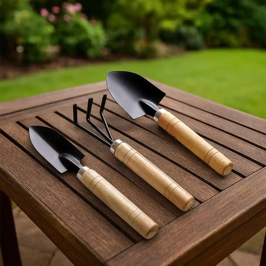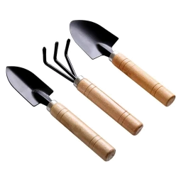 3 Pc Garden Tool Kit – Durable Hand Tools Set with Wooden Handle (Trowel, Transplanter & Rake) for Gardening, Planting, Potting and Home Garden Maintenance This 3-piece garden tool kit is an essential set for gardening enthusiasts and homeowners who love maintaining their plants and garden. The set includes a trowel, transplanter, and rake, all crafted with durable metal heads and sturdy wooden handles for comfortable grip and long-lasting use.