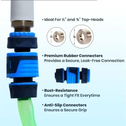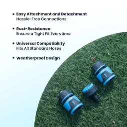 Effortlessly upgrade your watering system with these high-quality quick-connect hose pipe connectors, designed to fit most standard garden hoses and nozzles. Built to withstand extreme weather conditions, including heat, rain, and cold, these connectors ensure durability and long-lasting performance. The premium rubber construction is rust-resistant and provides a secure, leak-free connection to taps and attachments. Featuring rubberized grips, the connectors offer a non-slip hold, even when wet, simplifying setup and storage for a hassle-free gardening experience.