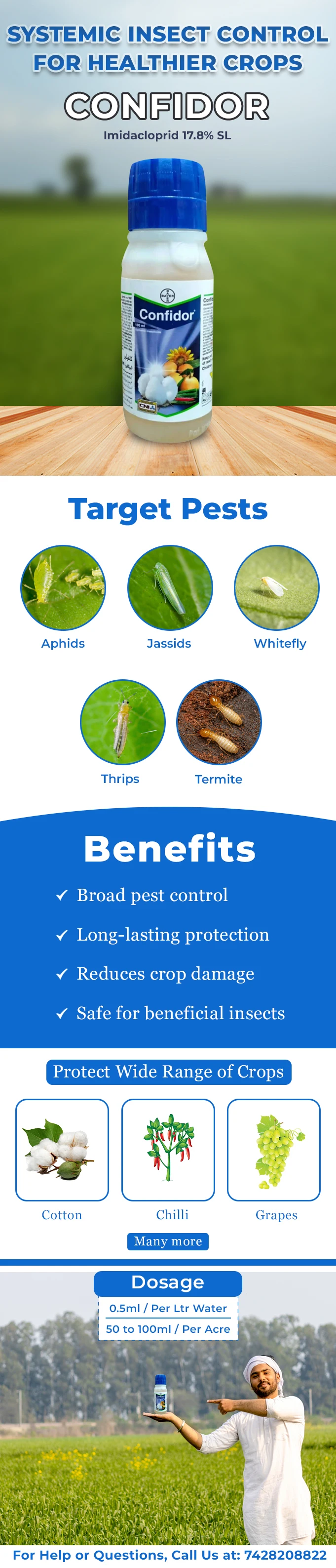 Bayer Confidor insecticide is effective against pests like Aphids, Jassids, Thrips, Whiteflies, Brown Plant Hoppers, White-Backed Plant Hoppers, Green Leaf Hoppers, Termites, Thrips, Leaf miners, Psylla, and Flea beetles.
