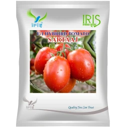 Iris Hybrid F1 Tomato Sartaaj is a high-yielding, early maturing hybrid tomato variety ideal for commercial farming. The plant is semi-determinate, producing uniform, attractive red fruits that are square-round in shape and weigh around 90-100 grams each. It matures within 65-70 days after transplanting, allowing multiple crop cycles per year. Sartaaj shows excellent tolerance to Tomato Yellow Leaf Curl Virus (TYLCV) and bacterial wilt. Its firm fruits and wide sowing window make it a farmer-favorite hybrid for profitability and consistent performance.