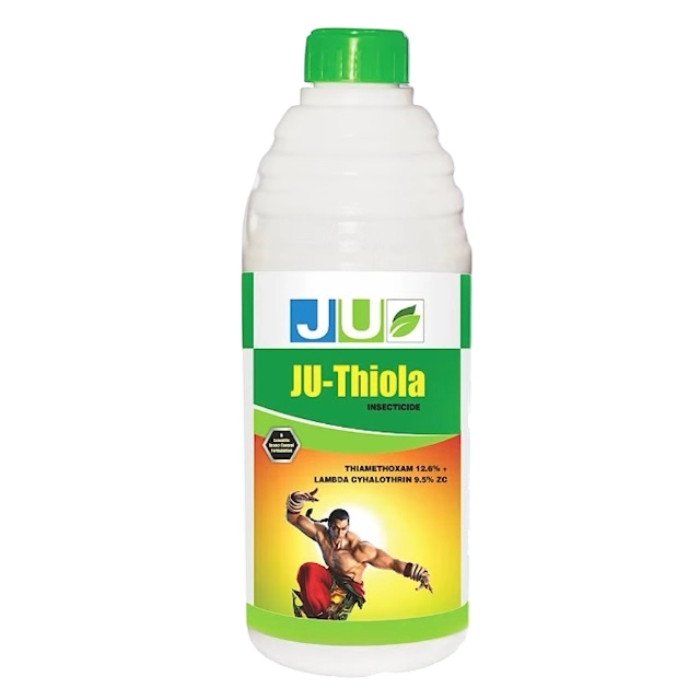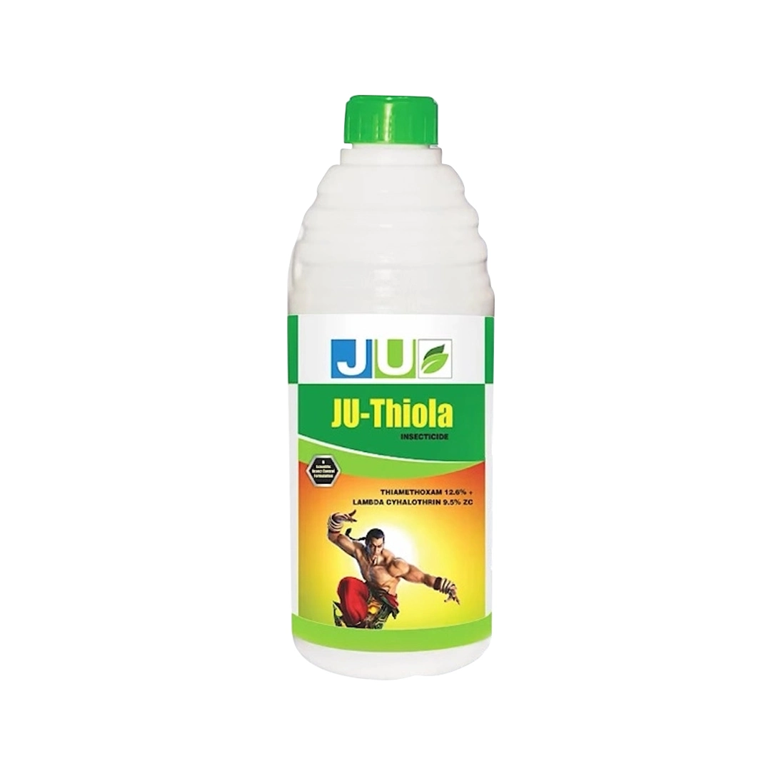 JU Thiola is an effective insecticide containing Thiamethoxam 12.6% + Lambda Cyhalothrin 9.5% ZC, which works by attacking the insect's nervous system, leading to paralysis and death. It has a dual mode of action, providing systemic and contact action, making it a powerful solution against sucking pests and caterpillars in crops like cotton, tea, tomato, and more. JU Thiola insecticide delivers a quick knockdown, ensuring better yields as crops grow pest-free.