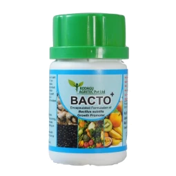 Kodagu Bacto+ (5 Capsule Pack) is an advanced biofertilizer formulation containing encapsulated Bacillus subtilis with a minimum of 5 × 10⸠cells per gram. This beneficial bacterium promotes plant growth, increases yield, and protects against nematodes, fungal, and bacterial diseases. It strengthens plant defense mechanisms, making crops more resistant to pathogen attacks. Bacto+ is suitable for all agricultural and horticultural crops and can be applied through soil application, drip irrigation, or seed treatment, supporting sustainable farming practices.