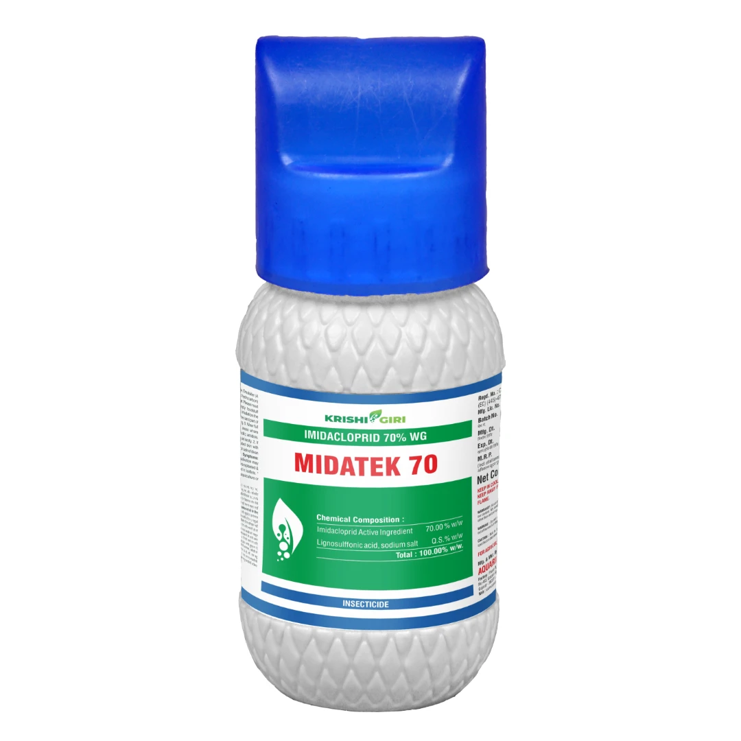 Krishigiri Midatek 70 Imidacloprid 70% WG is a high-performance, systemic insecticide specially formulated to control a wide range of sucking pests that significantly reduce crop productivity. Its advanced water-dispersible granule formulation ensures quick absorption by plants, delivering long-lasting protection against aphids, jassids, thrips, whiteflies, and hoppers. Suitable for major crops such as cotton, rice, okra, tomato, and cucumber, Midatek 70 enhances plant vigor and supports healthier growth. It is compatible with commonly used pesticides and provides reliable pest management for higher yields.