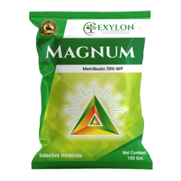 Magnum (Metribuzin 70% WP) is a highly effective selective herbicide produced by Exylon, designed to control a wide range of weeds in various crops. With its high concentration of Metribuzin, Magnum provides reliable control over both broadleaf and grassy weeds, ensuring healthier crops by reducing weed competition.