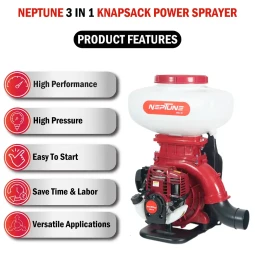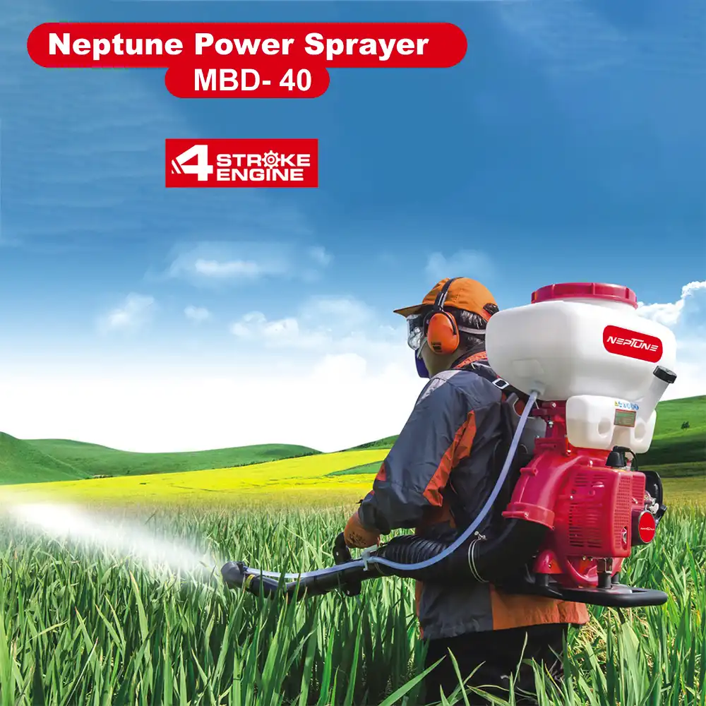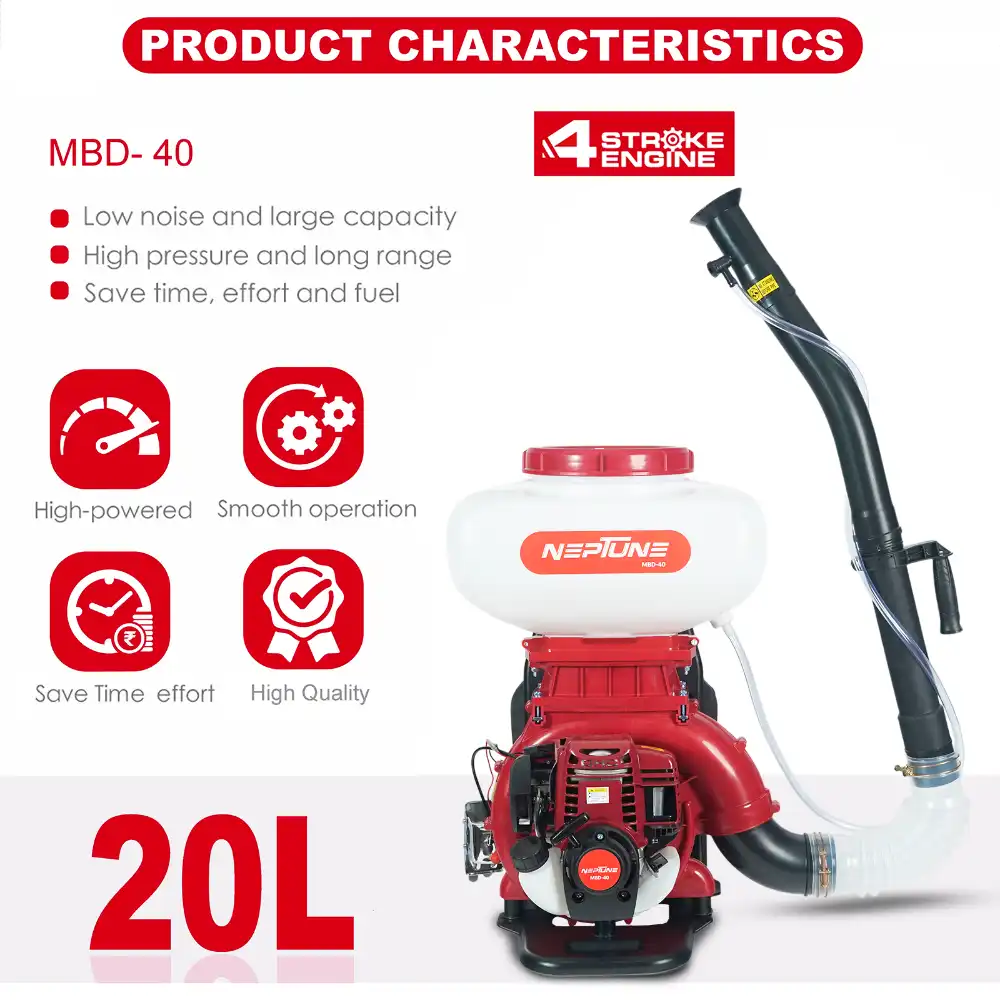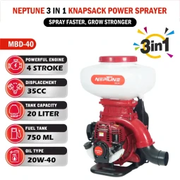 The Neptune MBD-40 is a versatile 2-in-1 knapsack mist blower and powder duster powered by a fuel-efficient 4-stroke 35CC petrol engine. Featuring a large 20L tank, it is ideal for effective spraying and dusting in farming and gardening. Durable, lightweight, and perfect for pest control and crop protection.
