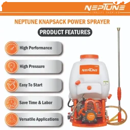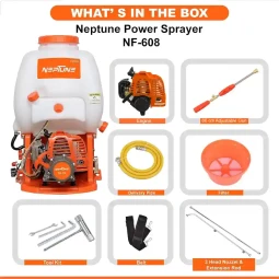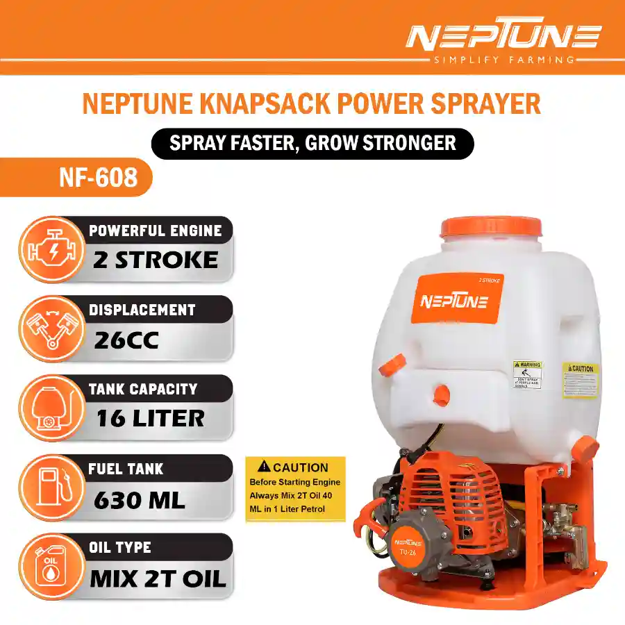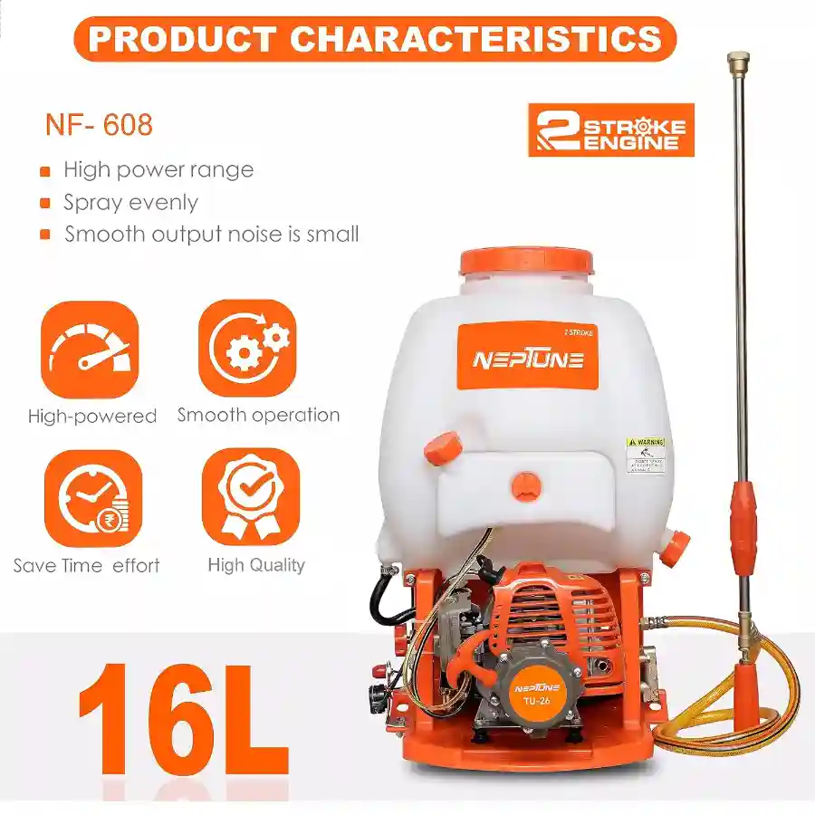 Neptune Model-608 features a 2-stroke 26CC petrol engine with a 16L tank, delivering powerful and consistent spraying. Comes with 2 types of spray guns for varied use. Ideal for spraying pesticides, herbicides, and fertilizers in farming, agriculture, and garden areas.