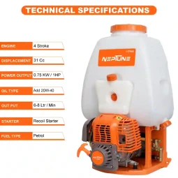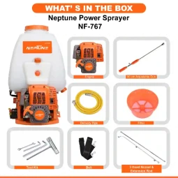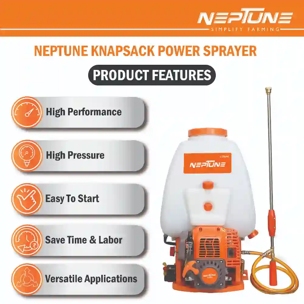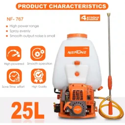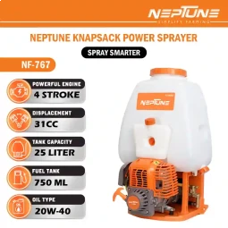 Neptune Model-767 is a powerful knapsack sprayer with a 4-stroke 31CC petrol engine and a large 25L tank for extended use. It includes 2 types of spray guns for versatile applications, ideal for spraying pesticides and fertilizers in farming, agriculture, and gardens