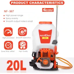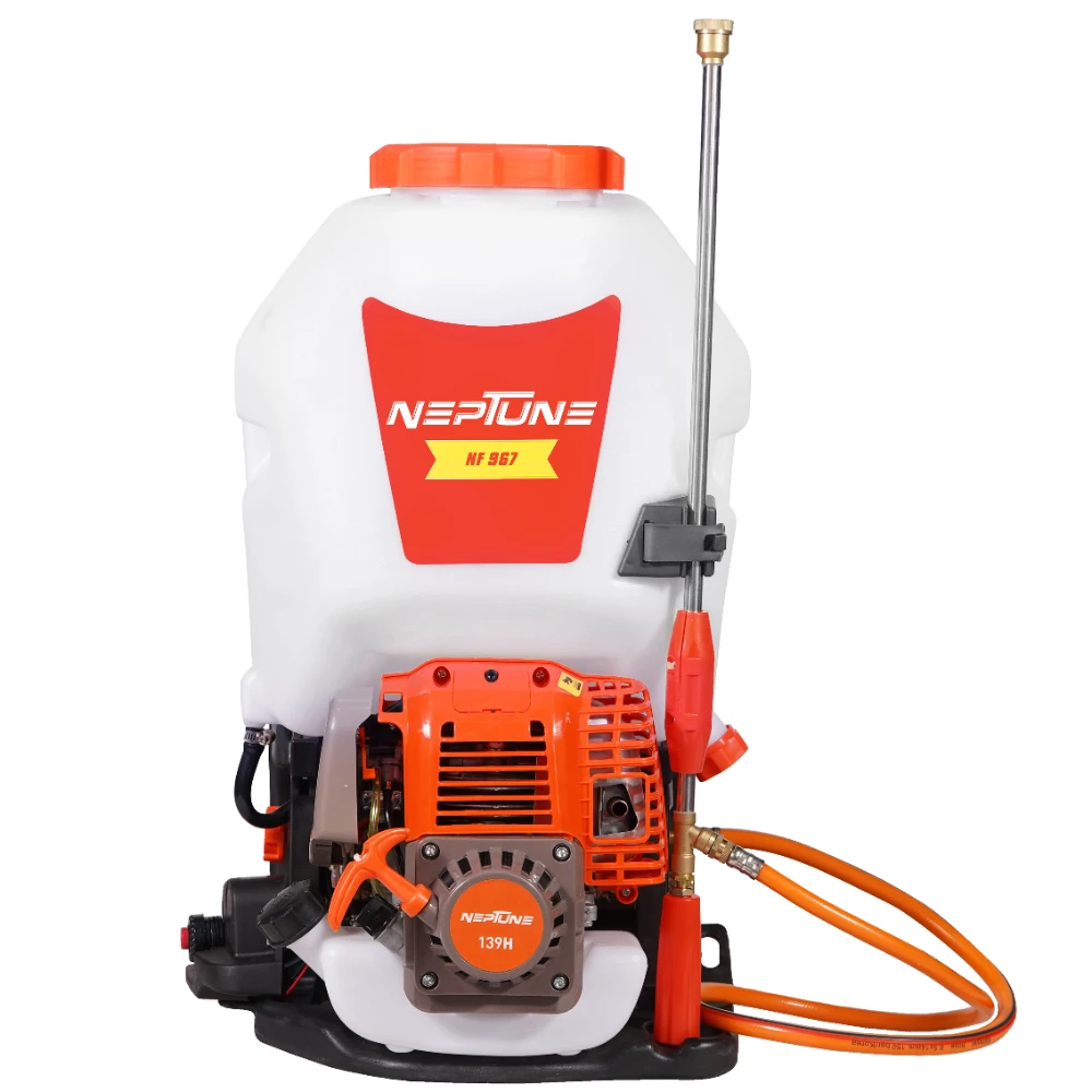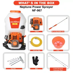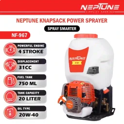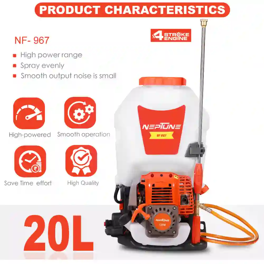 Neptune Model-967 features a powerful 4-stroke 31CC petrol engine and a 20L tank for efficient spraying. It comes with 2 types of spray guns for versatile use, making it ideal for farming, agriculture, and garden tasks. Built for durability and long-lasting performance.