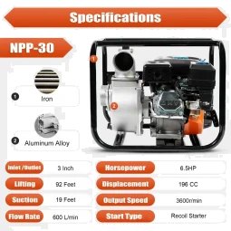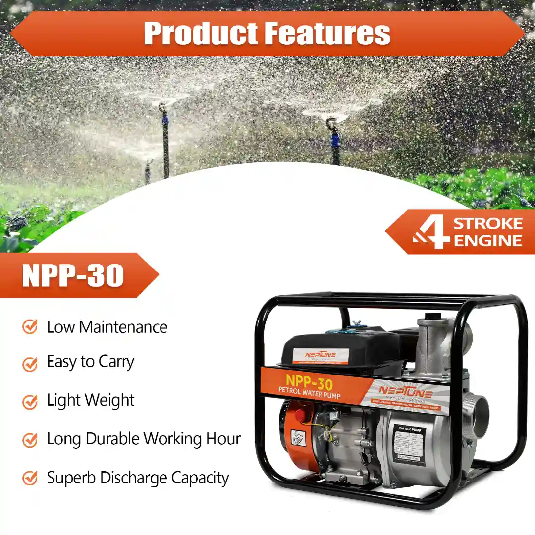 The Neptune NPP-30 Water Pump features a 3-inch outlet, powerful 6.5 HP 196cc 4-stroke petrol engine, and delivers 3600 RPM for efficient water transfer. Ideal for farming, irrigation, draining, and gardening. Built for durability and performance in tough conditions.