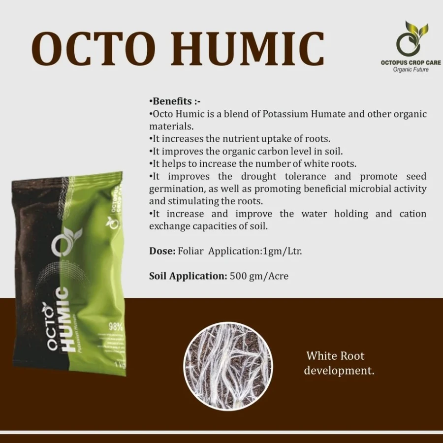 Octopus Octo Humic 98% is a premium soil conditioner designed to enhance soil fertility and promote strong root development. Enriched with potassium humate and other organic materials, it improves organic carbon levels, water holding capacity, and cation exchange properties of the soil. It stimulates beneficial microbial activity, enhances nutrient absorption by roots, increases drought tolerance, and encourages better seed germination, resulting in healthier plants and improved crop yields.