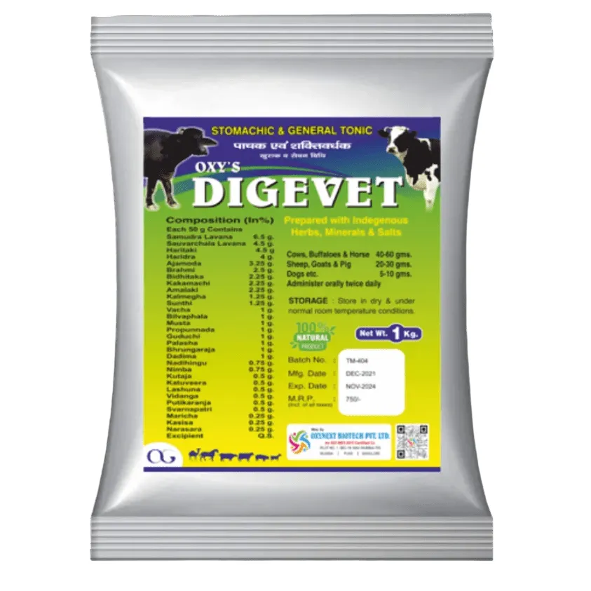 OXYNEXT Digevet Animal Feed Powder is a scientifically formulated blend of digestive enzymes and high-potency probiotics designed to improve digestion, stimulate appetite, and restore ruminal microflora in livestock. It helps prevent anorexia, supports efficient energy production, and aids recovery from conditions such as impaction, mild colic, ruminal atony, and general weakness. Regular use enhances nutrient utilization, improves feed efficiency, and promotes overall health and vitality in animals.