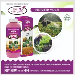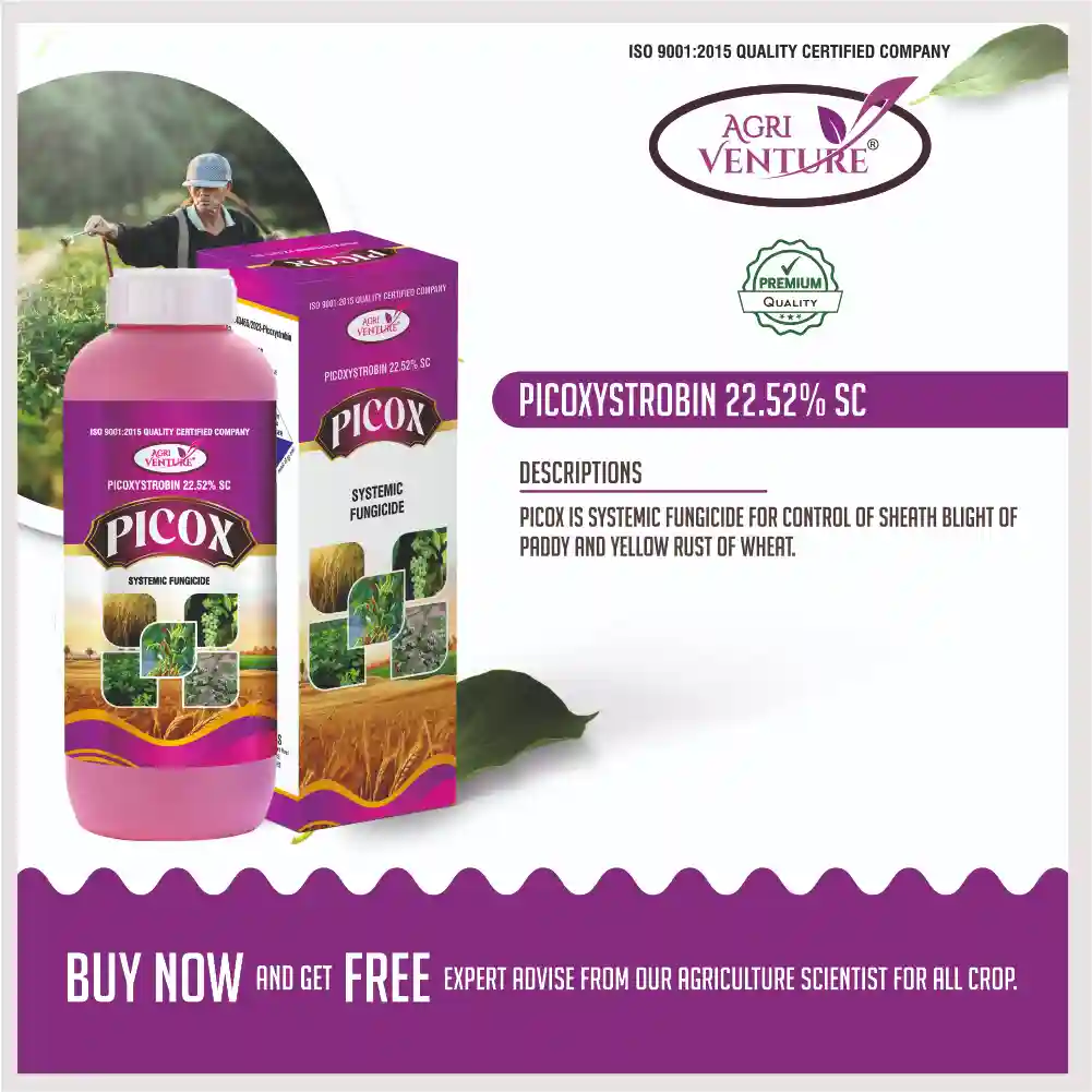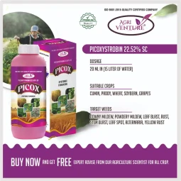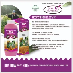 Agriventure Picox Picoxystrobin 22.52% SC Fungicide is a next-generation strobilurin fungicide designed for superior control of a wide range of fungal diseases. It offers systemic, translaminar, and vapor activity, ensuring deep protection within plant tissues. PICOX helps improve photosynthesis, plant vigor, and crop quality while preventing key fungal infections such as rusts, mildews, and leaf spots. Its advanced formulation ensures long-lasting effectiveness and higher yield potential.