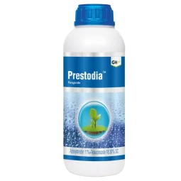 GH Prestodia Fungicide is a superior broad-spectrum systemic fungicide formulated with Azoxystrobin (QoI group) and Tebuconazole (triazole group). The dual-action chemistry ensures effective protection by inhibiting spore germination, mycelial growth, and ergosterol biosynthesis in fungi. It provides excellent preventive, curative, and eradicative action, ensuring healthy crop growth and higher yields.