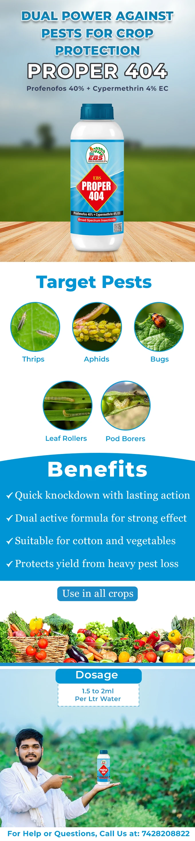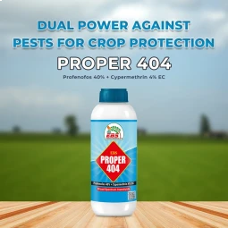 EBS Proper 404 is a powerful insecticide that contains two active components, Profenofos 40% + Cypermethrin 4% EC. These components are used to control sucking and chewing pests on all types of crops through stomach and contact action. This dual-action formula provides comprehensive pest management through synergistic activity, promoting healthy crops.