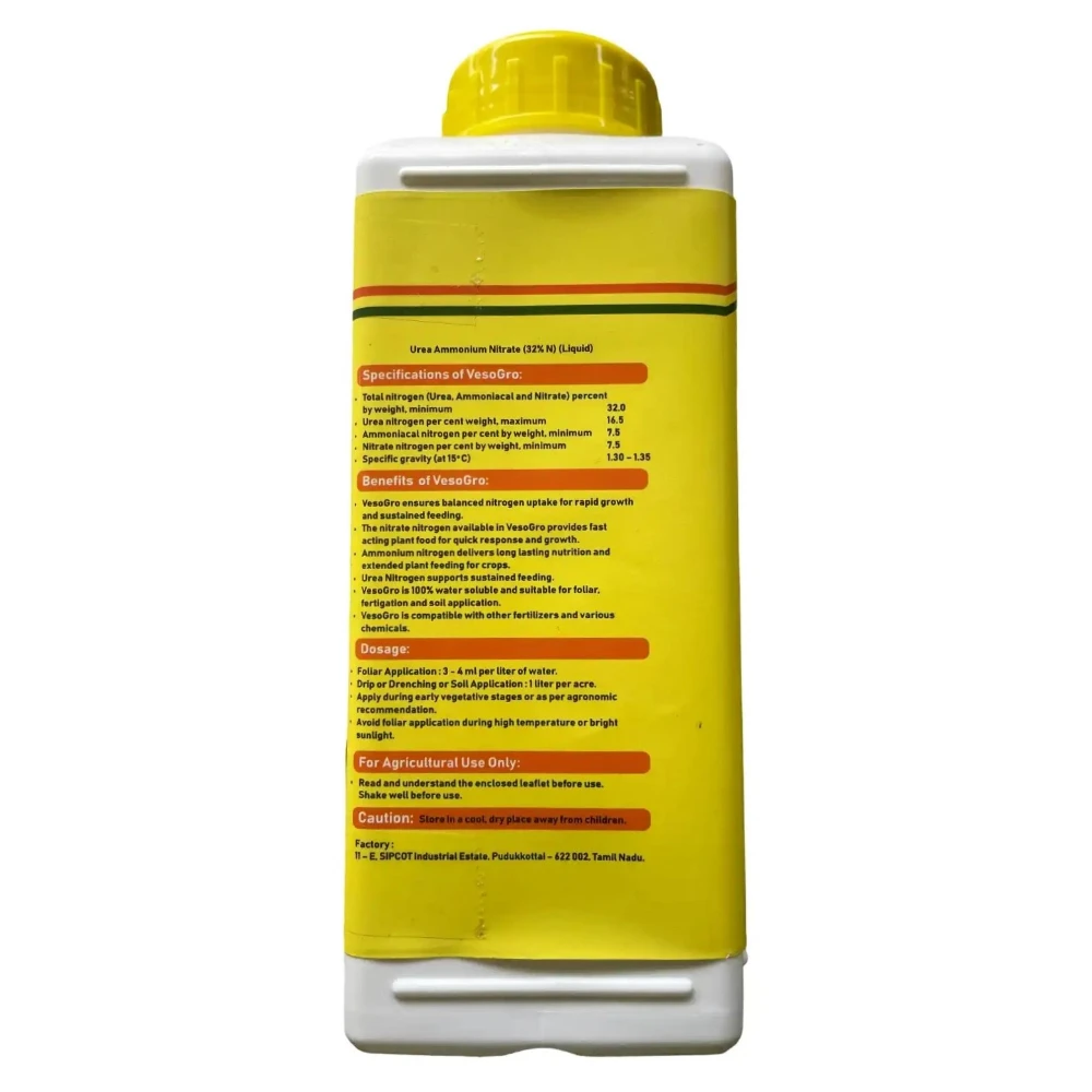 Ramcides Vesogro is a high-quality straight nitrogenous fertilizer containing Urea Ammonium Nitrate (UAN) with 32% Nitrogen. It delivers a balanced mix of nitrate nitrogen for quick uptake, ammonium nitrogen for medium-term feeding, and urea nitrogen for sustained release. Ideal for nitrogen-demanding crops, it supports vigorous vegetative growth, higher yields, and improved crop quality.