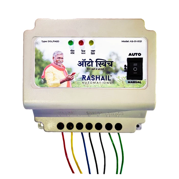 The Rashail DOL Phase Preventer Auto Switch is a heavy-duty protection device designed for large agricultural and industrial motors. It safeguards motors from phase failure, voltage fluctuations, and imbalance to prevent burnout and downtime. The automatic switching system provides a delay of approximately one minute when power is restored, ensuring safe startup. Built for high-performance motors, it is ideal for borewell pumps, irrigation systems, and commercial machinery. Easy 7-wire installation and a 3-month warranty make it a reliable motor safety solution.
