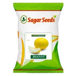 Sagar JHANVI F1 Hybrid Muskmelon from Sagar Seeds is a premium variety designed for high yield, excellent sweetness, and market appeal. The fruits are oblong in shape, weighing 1.5-2 kg, with attractive yellow skin and white crimson. The flesh is firm, juicy, and sweet with high TSS content of 14-15%. This hybrid is tolerant to fusarium wilt and sucking pests, ensuring healthy crop growth. With a maturity period of 65-75 days (depending on season), it offers farmers quick returns and excellent transport and shipping quality for long-distance markets.
