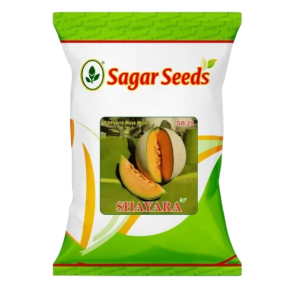 Sagar Shayara F1 Hybrid Muskmelon from Sagar Seeds is a high-yielding variety known for its attractive fruits and excellent market value. The plants produce round to oblong creamy yellow fruits with dense netting and firm, sweet orange flesh. Each fruit weighs around 1.0-1.1 kg and matures within 65-70 days after sowing. With excellent keeping quality and strong suitability for long-distance transportation, this hybrid ensures maximum profitability for farmers and traders.