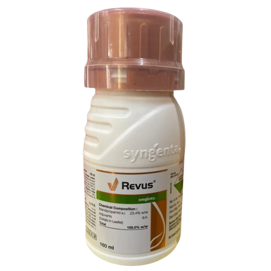 Syngenta Revus Mandipropamid 23.4% SC is a premium contact and translaminar fungicide developed for effective control of downy mildew and late blight in fruits and vegetables. With its advanced Lock & Flow technology, Revus rapidly spreads on the leaf surface and forms a strong protective shield. It provides excellent protection to new growth, tender leaves, and buds while ensuring rainfast action. Revus is highly effective when used as part of a preventive disease management program.