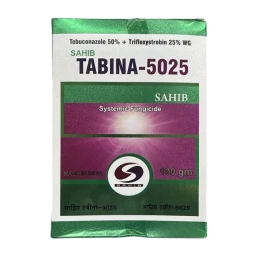SAHIB TABINA-5025 A broad-spectrum systemic fungicide combining the curative and protective power of Tebuconazole and Trifloxystrobin. It is effective against a wide range of fungal diseases in major crops like wheat, rice, soybean, chilli, and more. The WG (Water Dispersible Granule) formulation ensures better coverage, improved rainfastness, and long-lasting protection.