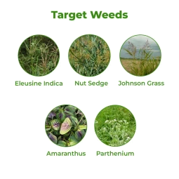 Glyphosate 71% SG is effective against weeds like Amaranthus, Parthenium, Cynodon dactylon, Eleusine indica, Nut sedge, Johnson grass, and others.