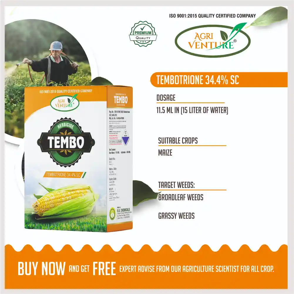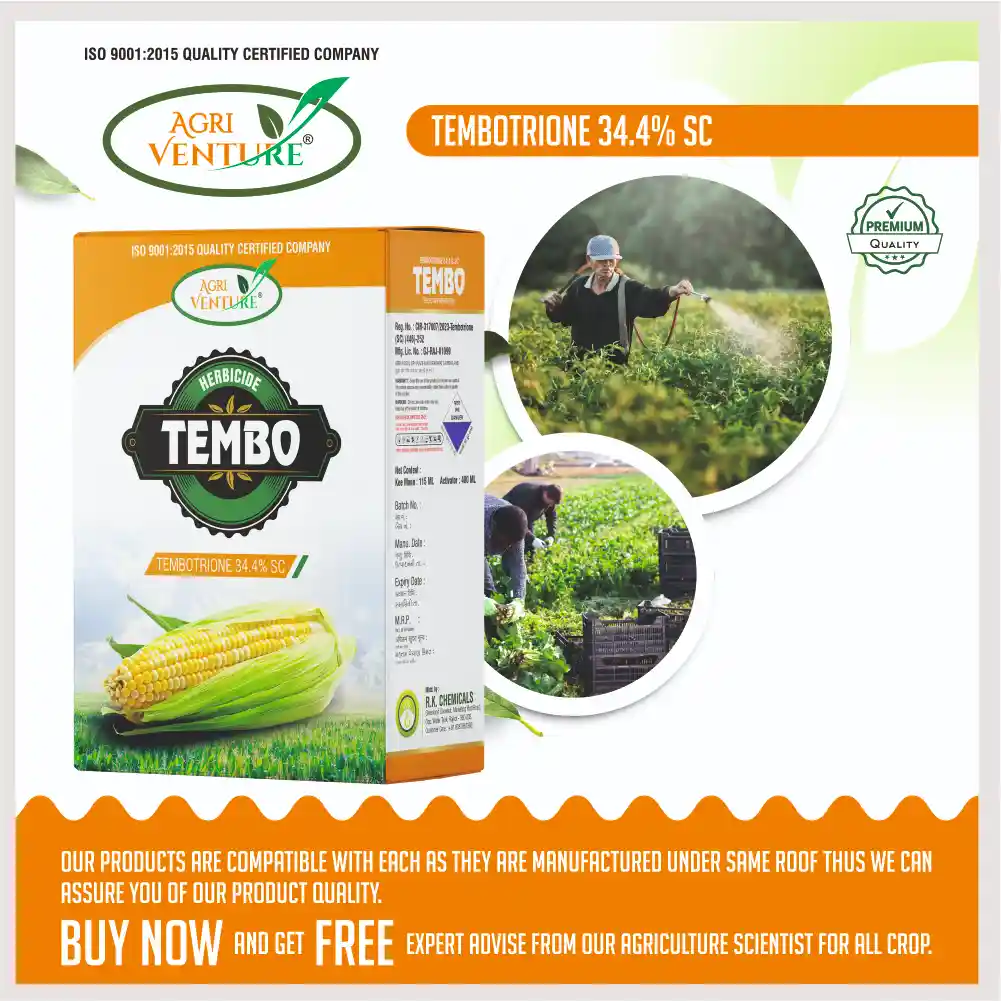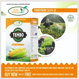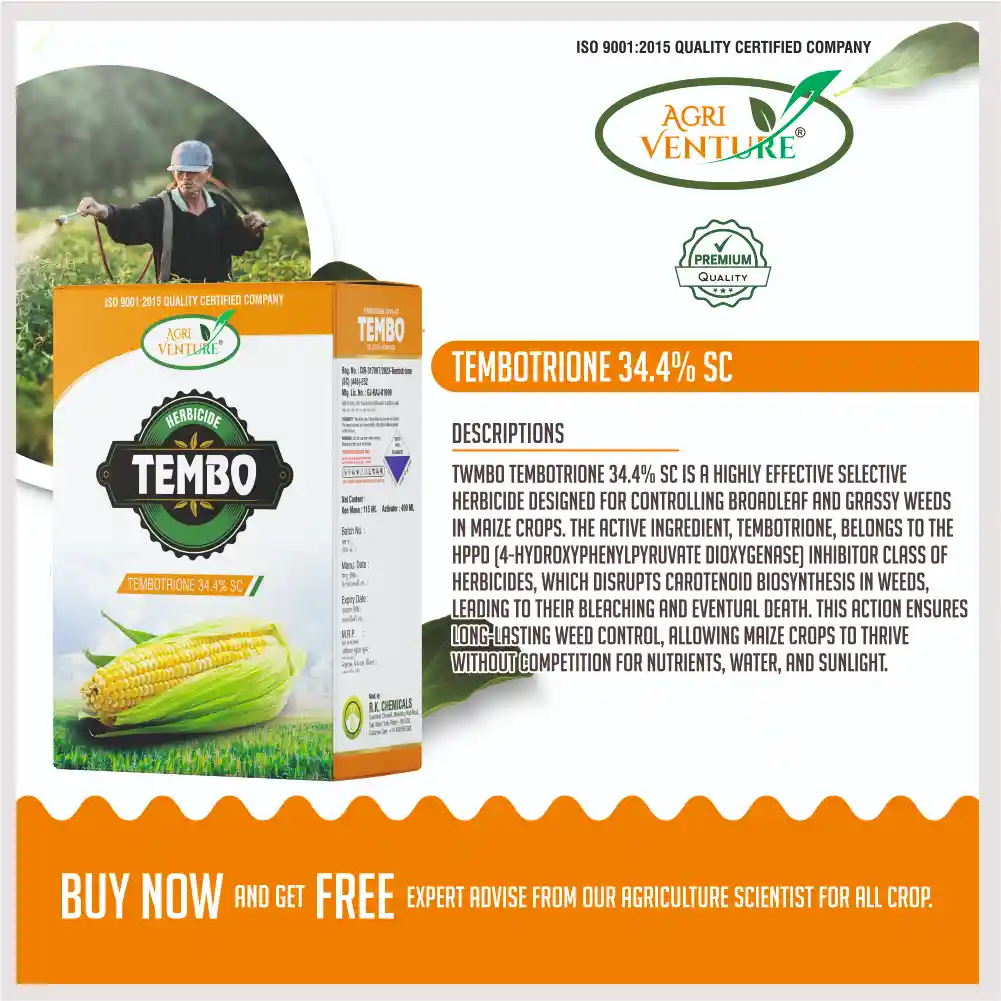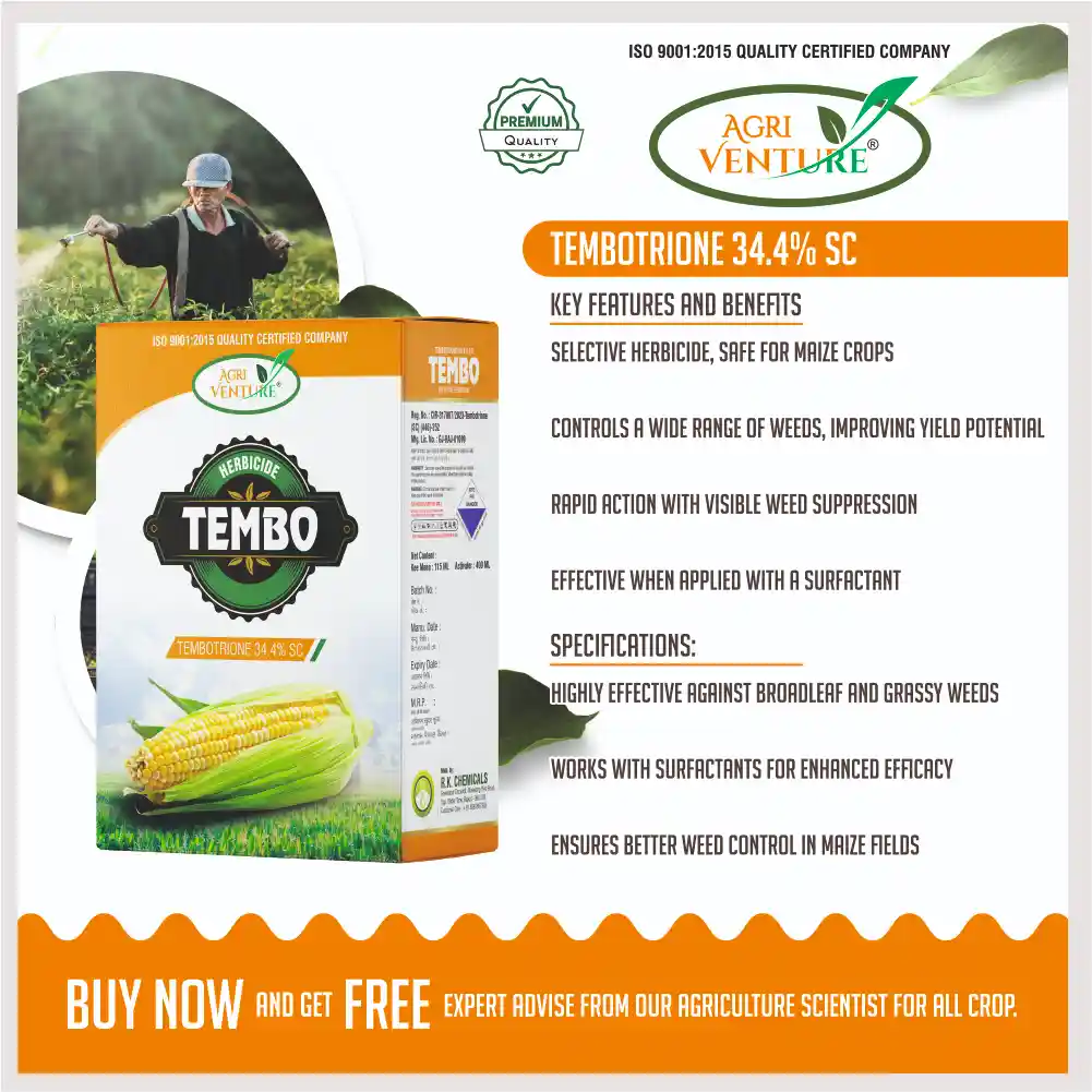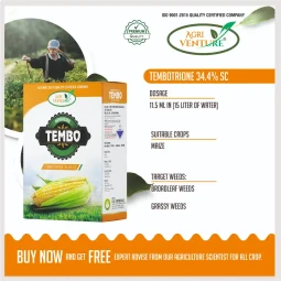 Agriventure TEMBO Tembotrione 34.4% SC Selective Herbicide is a powerful selective post-emergence herbicide formulated for effective control of both broadleaf and grassy weeds in maize crops. It works by inhibiting the HPPD enzyme, disrupting carotenoid synthesis, and leading to chlorophyll bleaching in weeds. TEMBO delivers rapid and long-lasting weed control, ensuring superior crop safety, consistent field performance, and flexibility for early to late post-emergence applications.