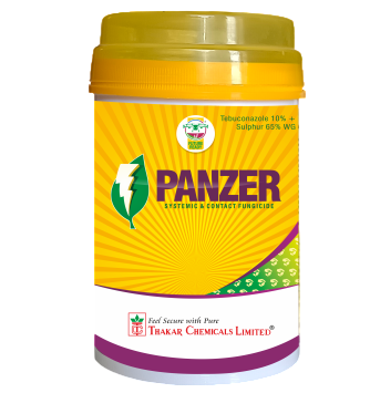 Thakar Panzer is an effective combination fungicide formulated with Tebuconazole 10% and Sulphur 65% WDG. It offers triple-action protection protective, curative, and eradicative against major fungal diseases. The systemic action of Tebuconazole combined with the contact action of Sulphur ensures broad-spectrum disease control. Thakar Panzer helps manage powdery mildew, leaf spot, rot, and pod blight diseases while delivering a phytotonic effect that improves crop health, yield, and produce quality.